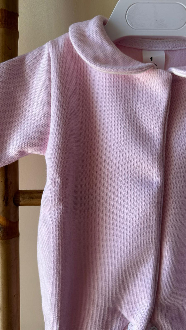 Com abertura total de molas de pressão à frente e no entrepernas para facilitar o vestir e a muda da fralda.