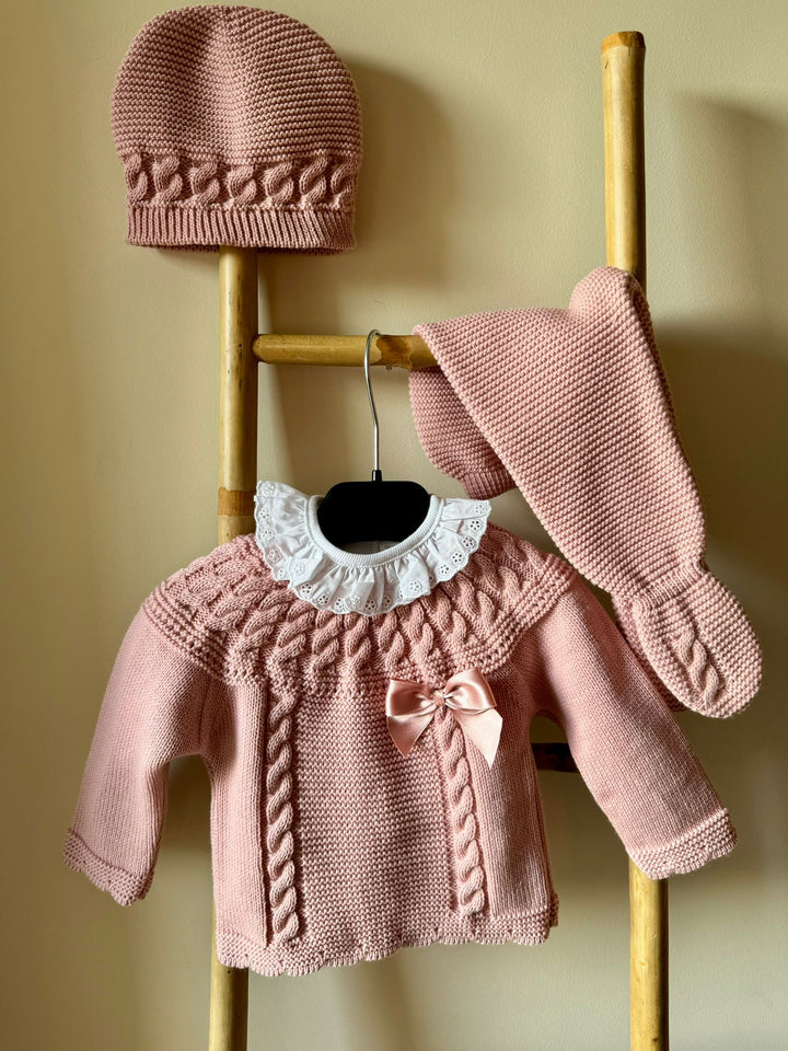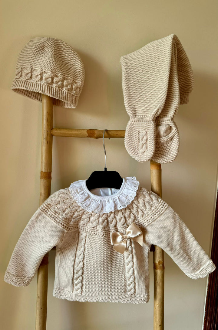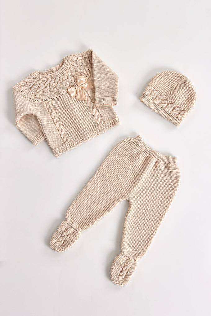 Conjunto de bebé em tecido de malha com três peças: camisola com abertura traseira, collants e gorro.