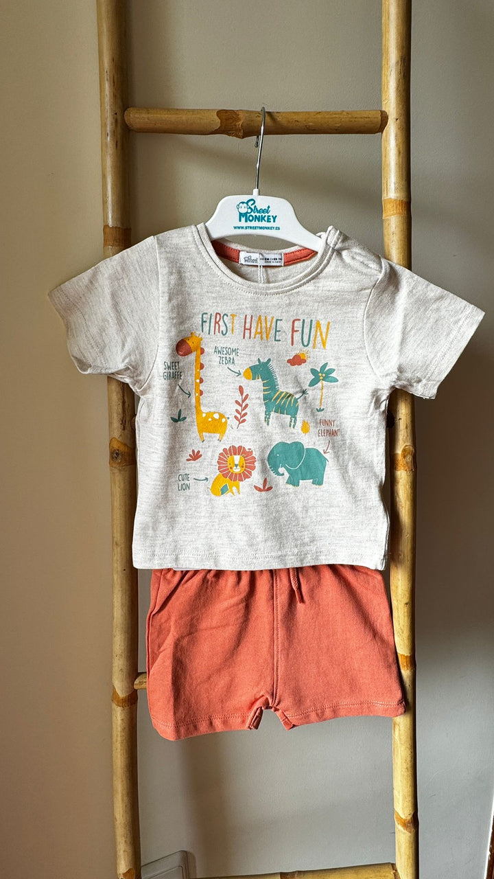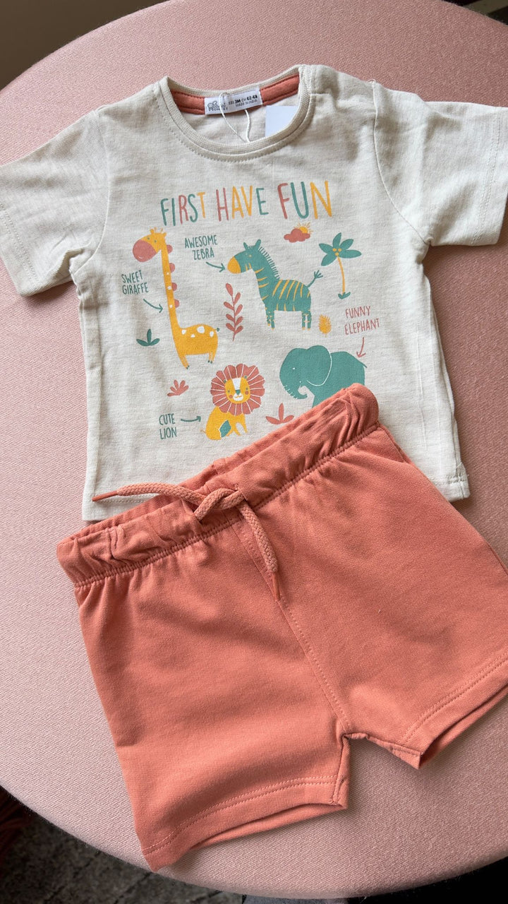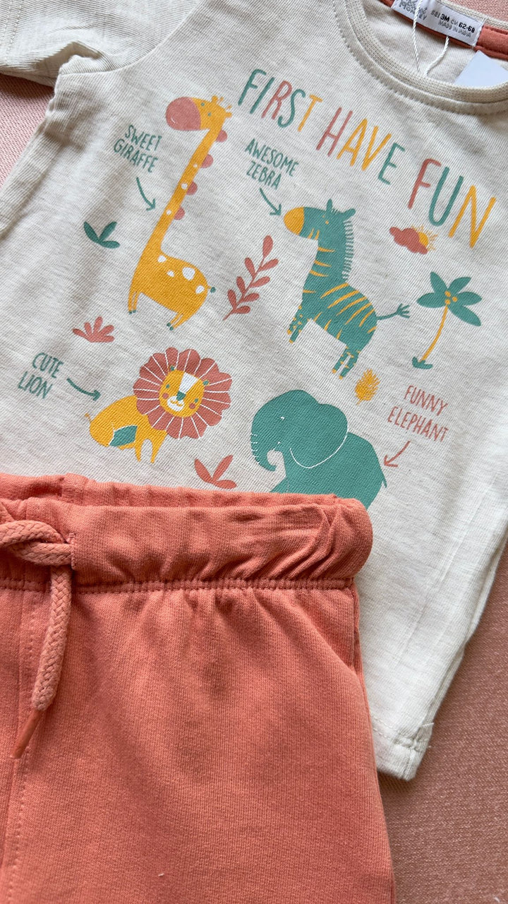 Conjunto muito confortável composto por tshirt e calções disponível 3 e 6 meses